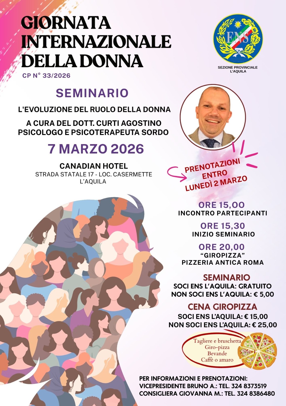 L’ENS dell’Aquila è lieto di comunicare che sabato 7 marzo 2026, in occasione della Giornata Internazionale della Donna, presso il Canadian Hotel a L’Aquila (Strada Statale 17, Località Casermette), si svolgerà il seminario del Dott. Agostino Curti, psicologo e psicoterapeuta sordo, dal titolo: